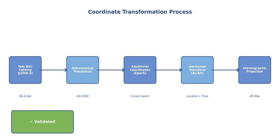 Saber dónde están catalogadas las estrellas no es suficiente. Necesitamos calcular dónde aparecen en el cielo vistas desde tu ubicación específica en el momento exacto que elegiste. Esto implica varias etapas de cálculos astronómicos: