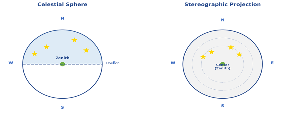 La proyección estereográfica es el método estándar utilizado en astronomía para crear mapas del cielo nocturno. Piénsalo como proyectar la bóveda celeste sobre un plano manteniendo las relaciones angulares correctas.