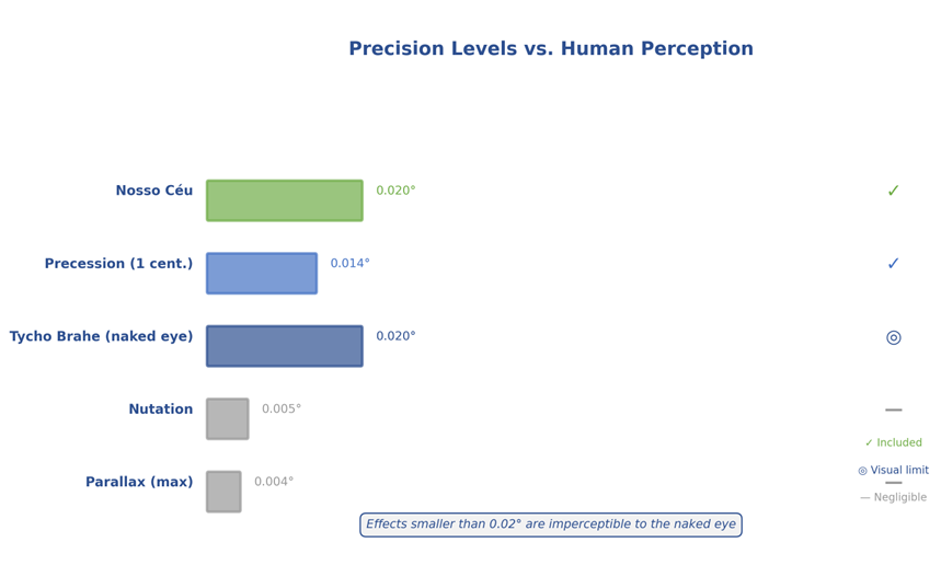 Para poner esto en perspectiva: Tycho Brahe (1546-1601), considerado el mayor observador a simple vista de la historia, solo podía percibir diferencias de 0.02° (72 segundos de arco). Todos los efectos que omitimos son significativamente menores que este límite histórico de la percepción humana.